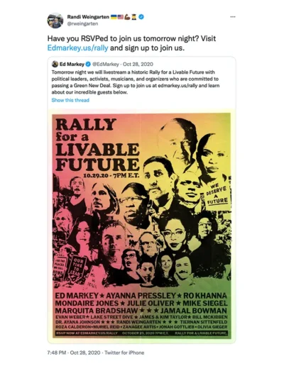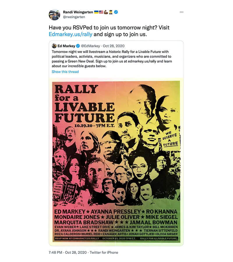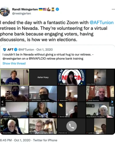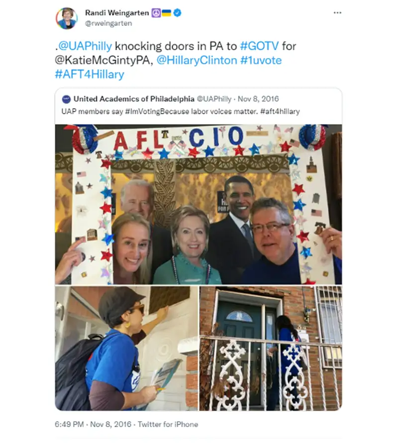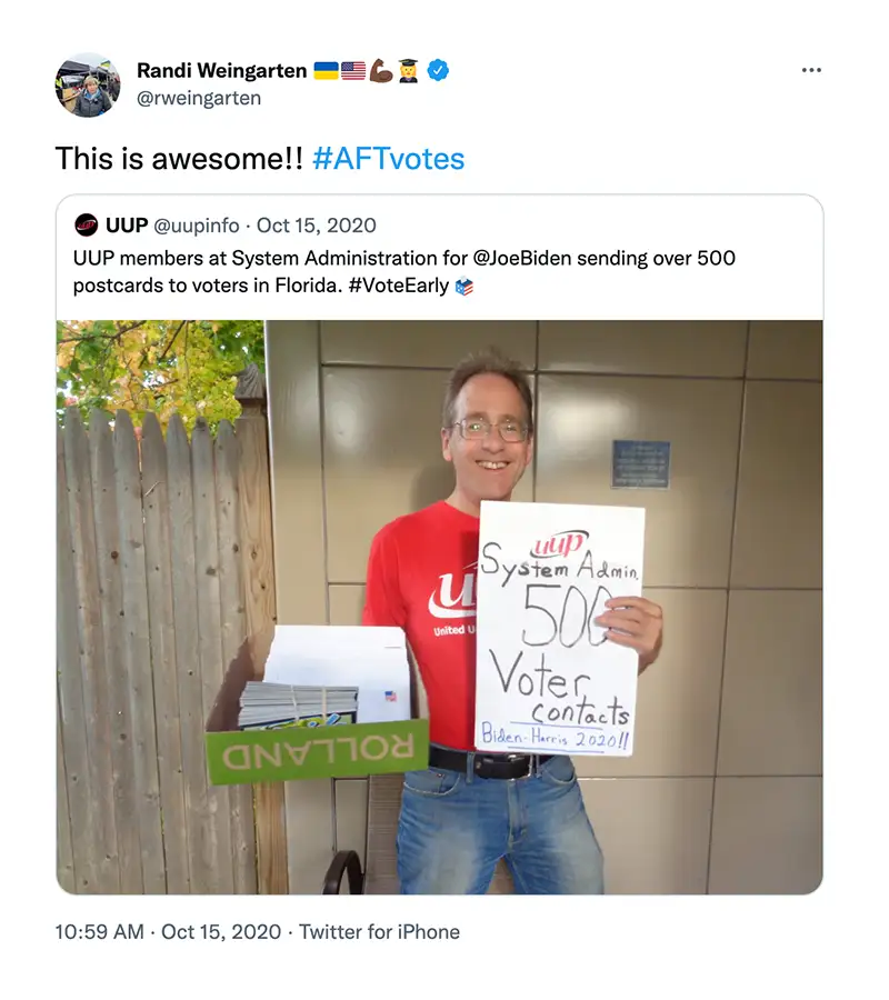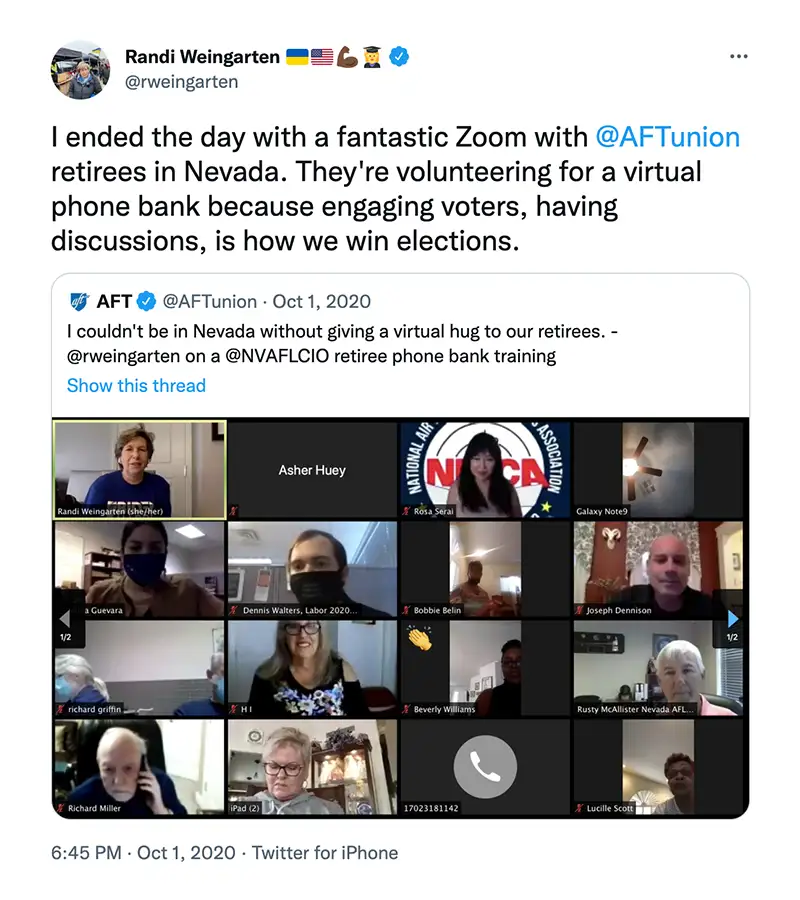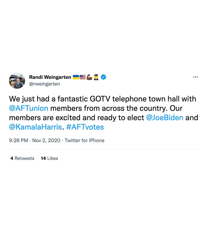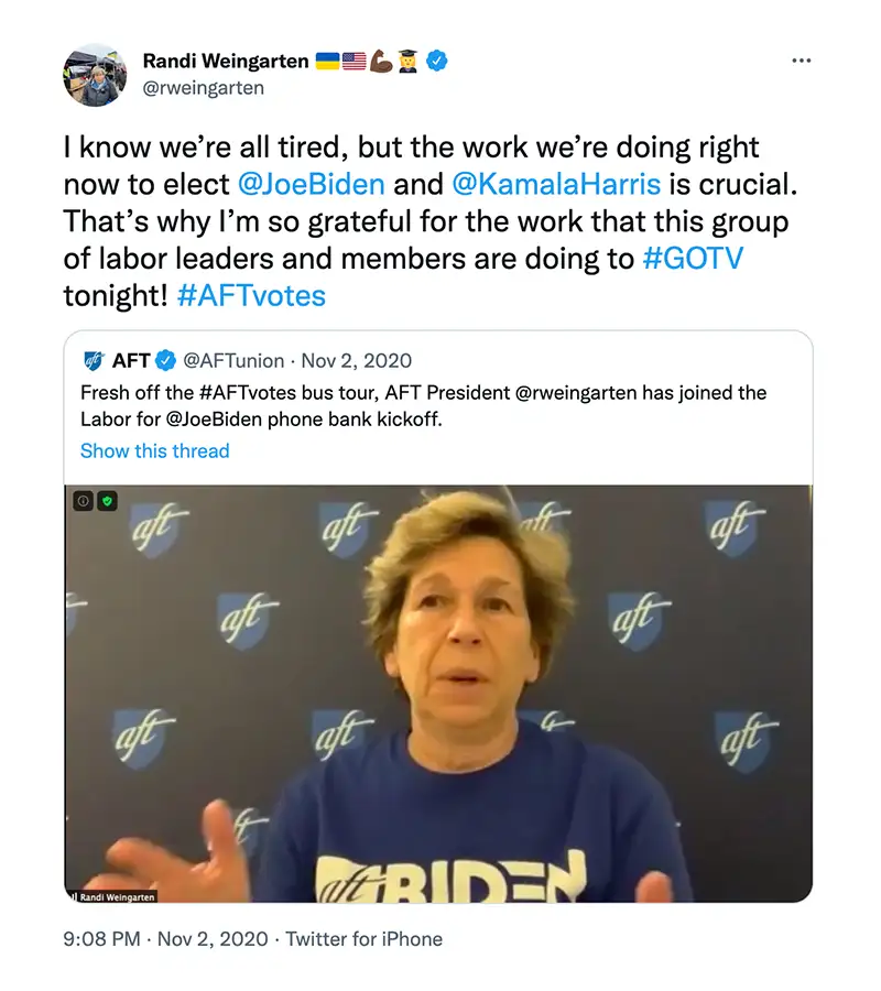 “I’ve seen firsthand the incredible work you have done to defeat Donald Trump and elect pro-public education, pro-worker, pro-healthcare, pro-climate, pro-justice, pro-democracy candidates starting with Joe Biden and Kamala Harris…”