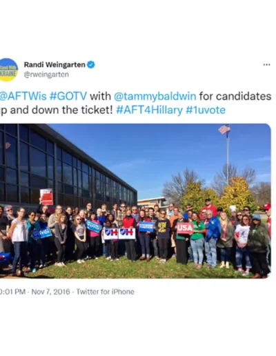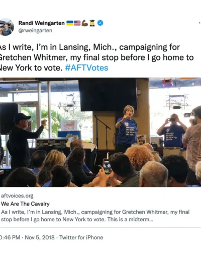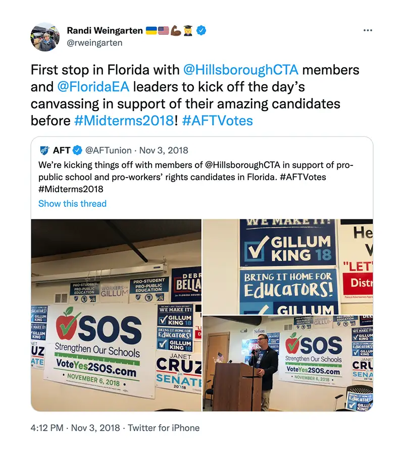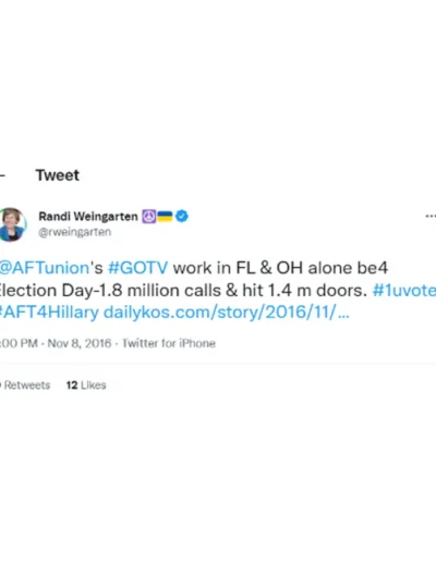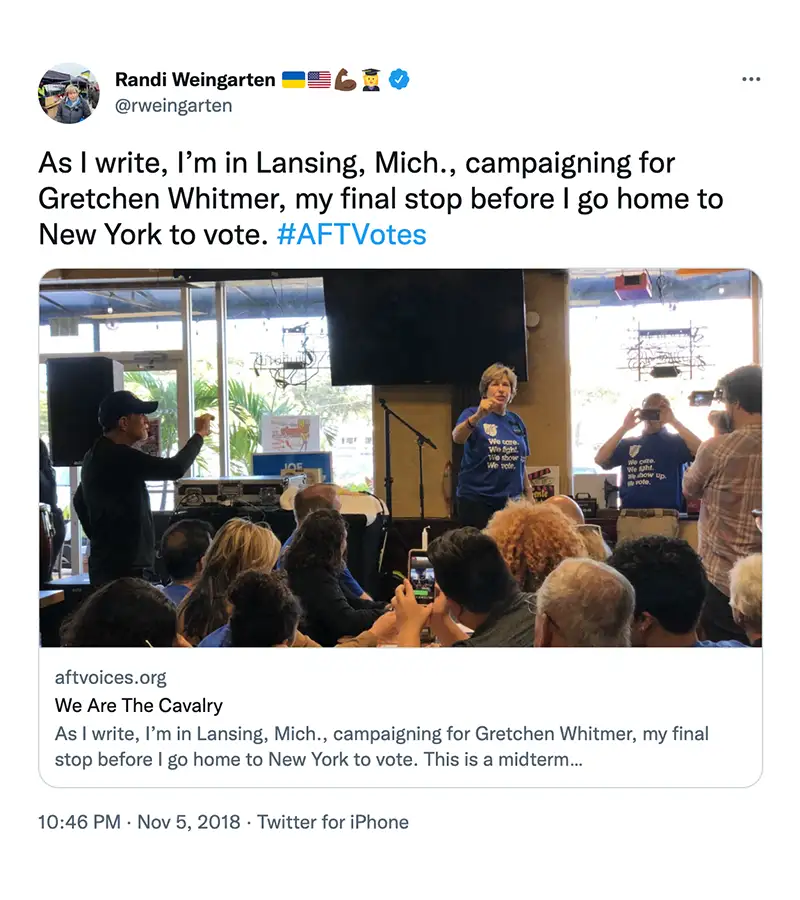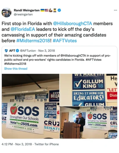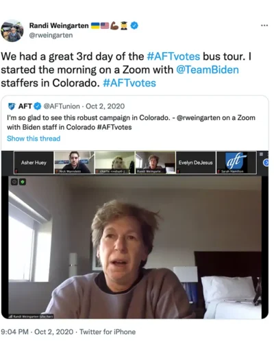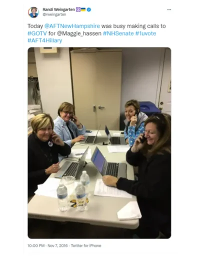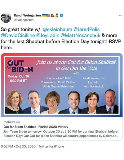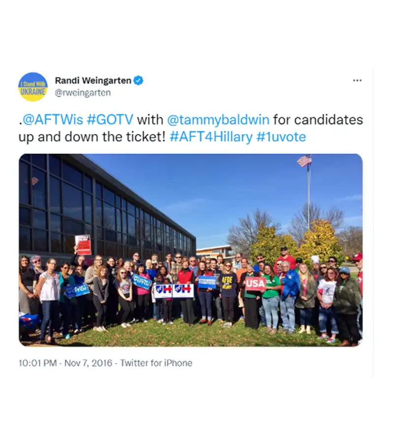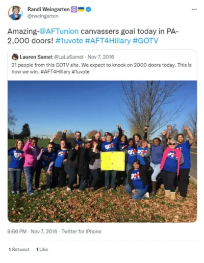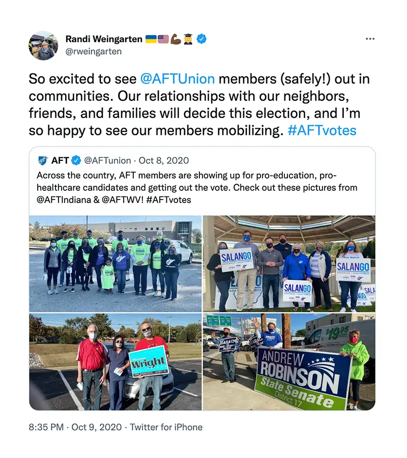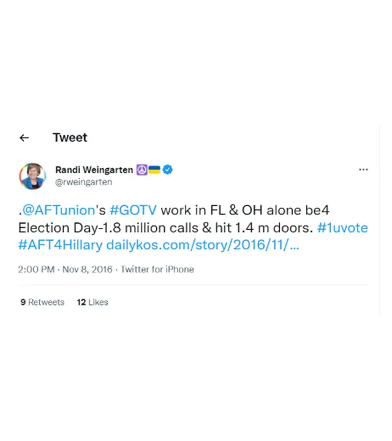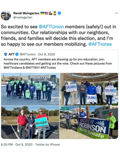 - During election seasons, Randi Weingarten sends as many as 80 tweets per day (and up to 550 per week) advocating for the election or defeat of candidates for public office.