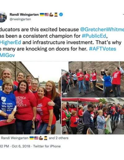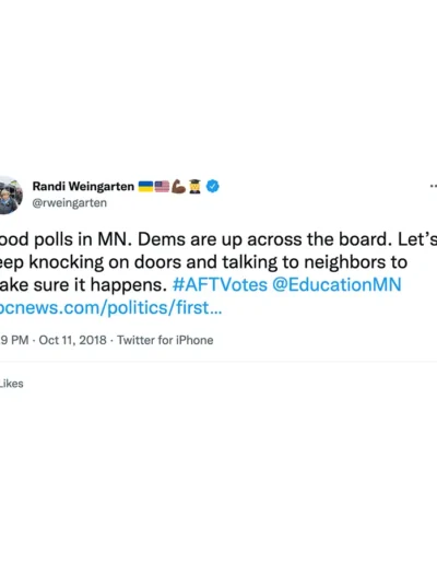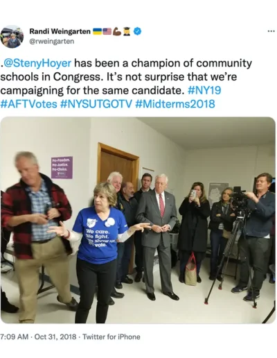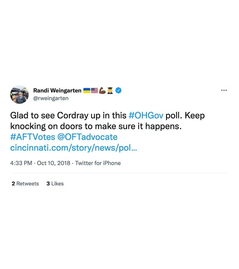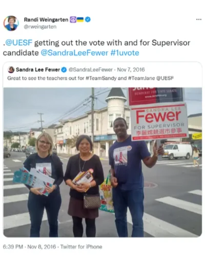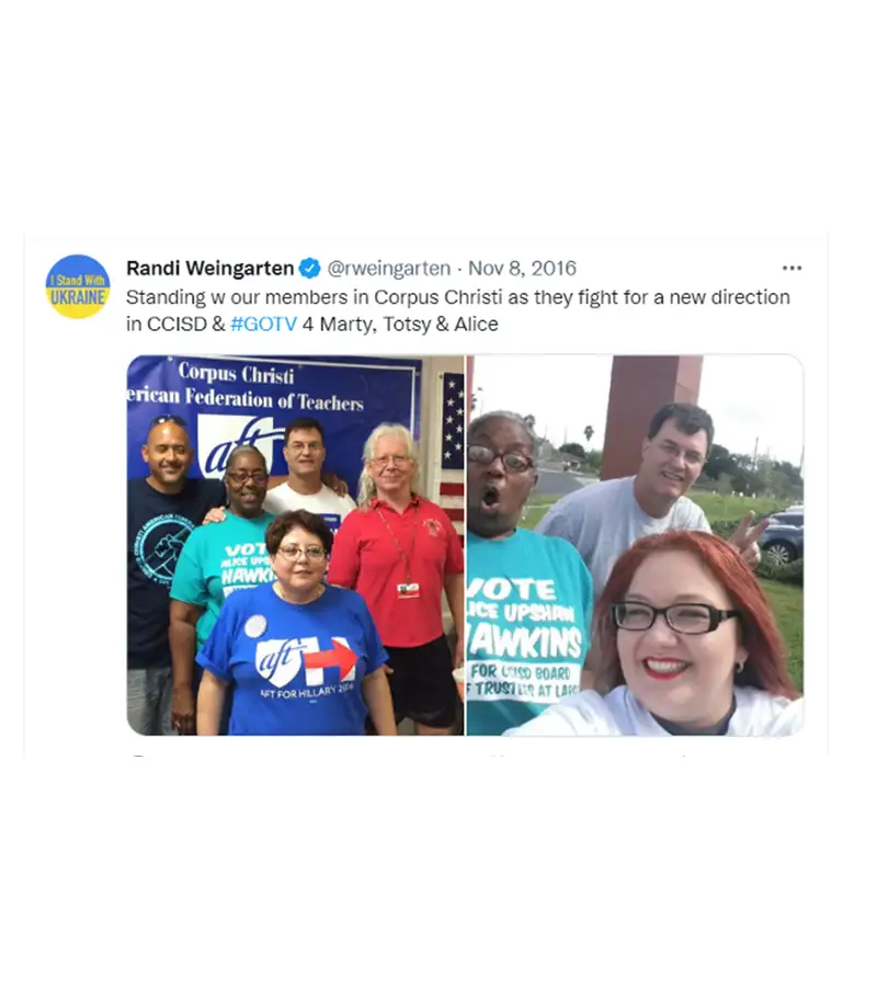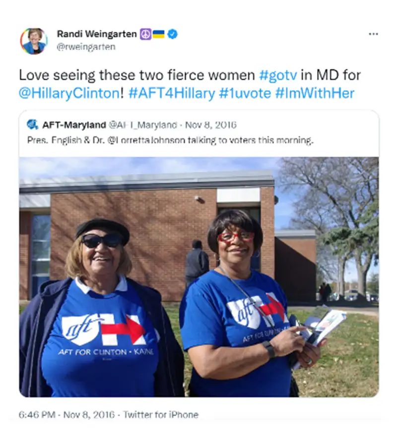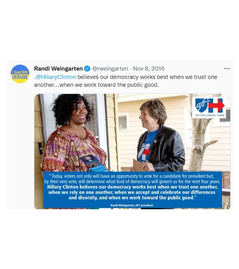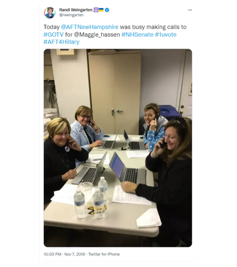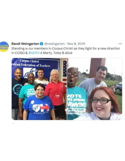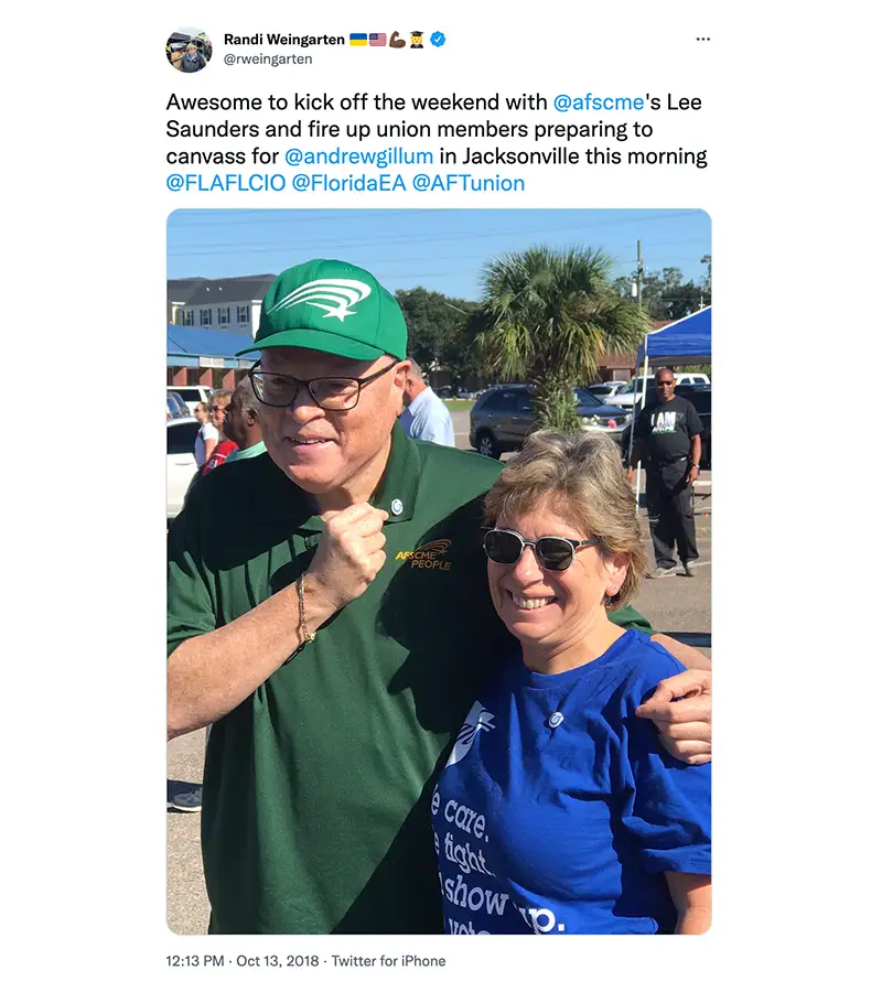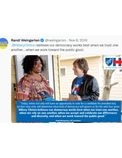 - During election seasons, Randi Weingarten sends as many as 80 tweets per day (and up to 550 per week) advocating for the election or defeat of candidates for public office.