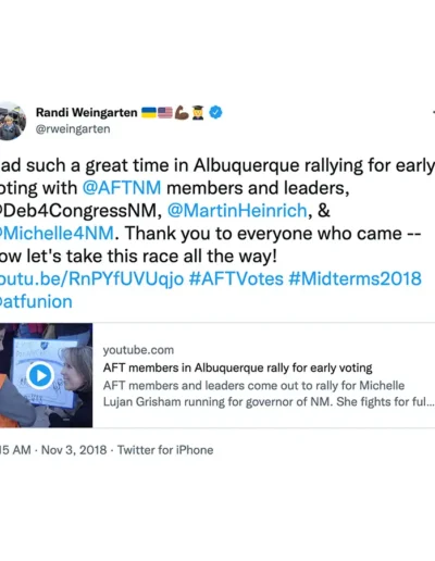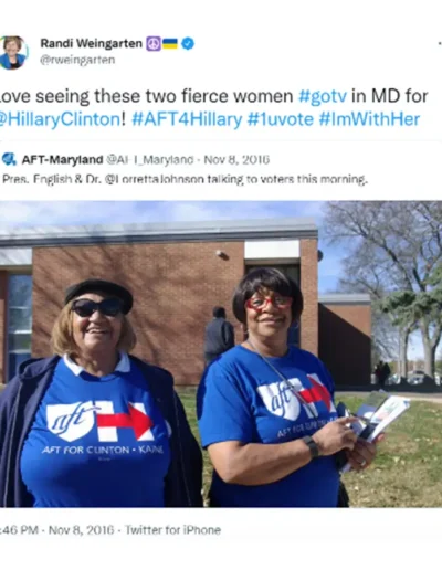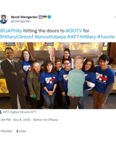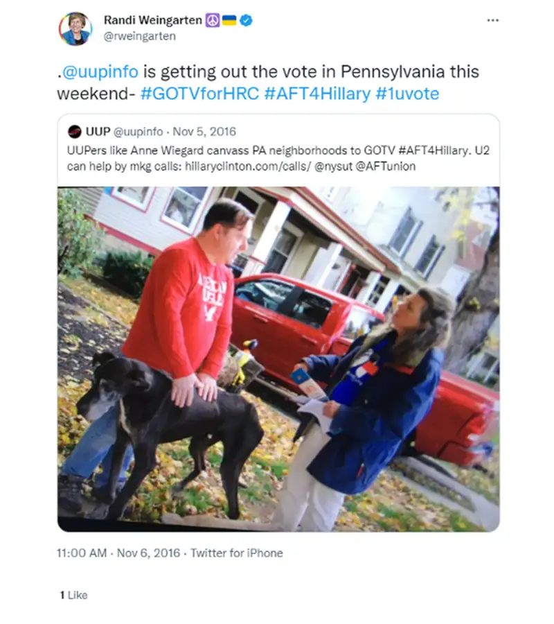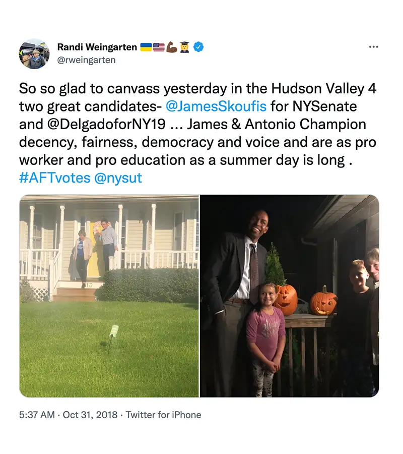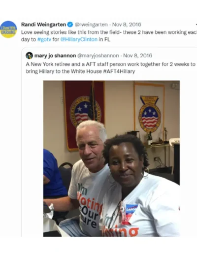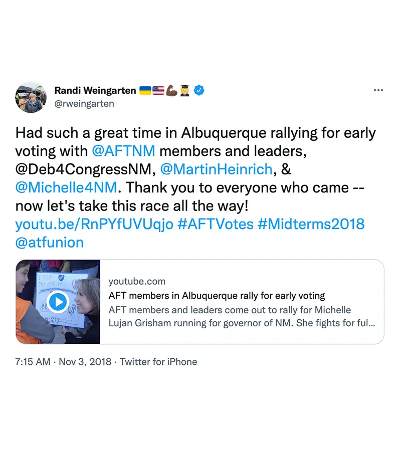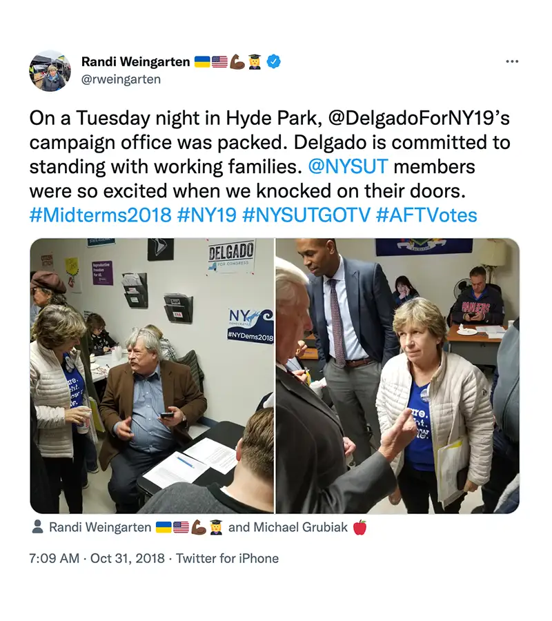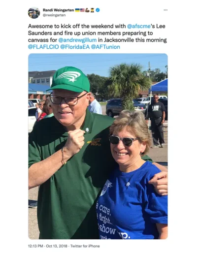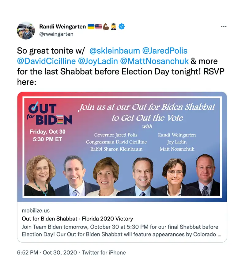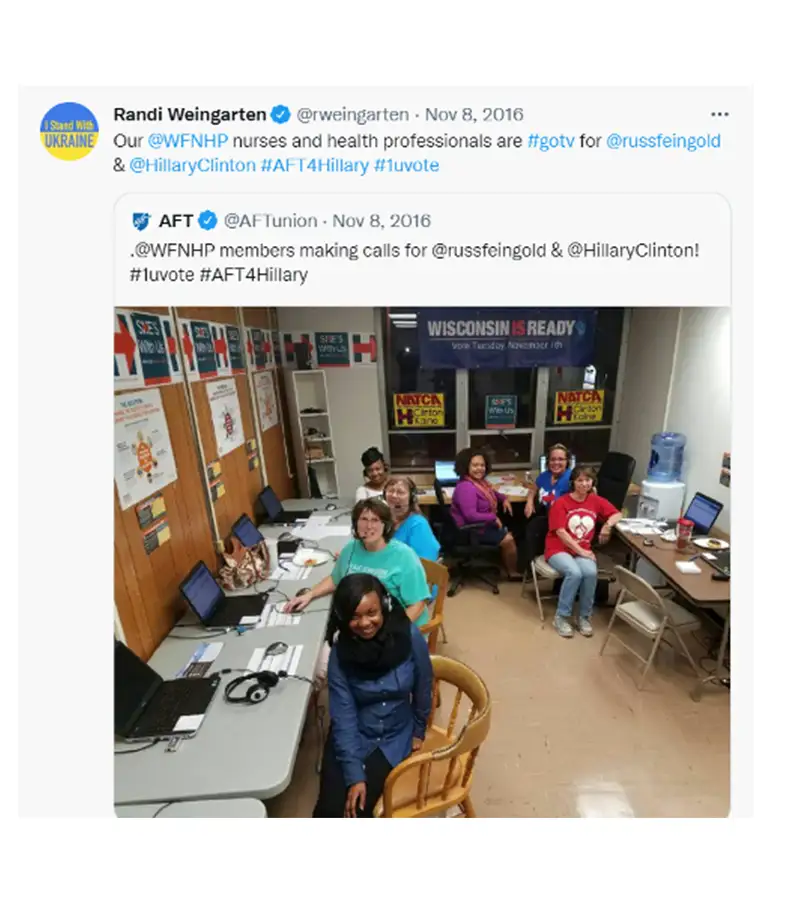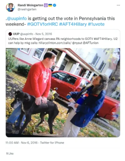 - During election seasons, Randi Weingarten sends as many as 80 tweets per day (and up to 550 per week) advocating for the election or defeat of candidates for public office.
