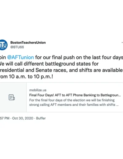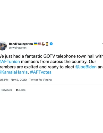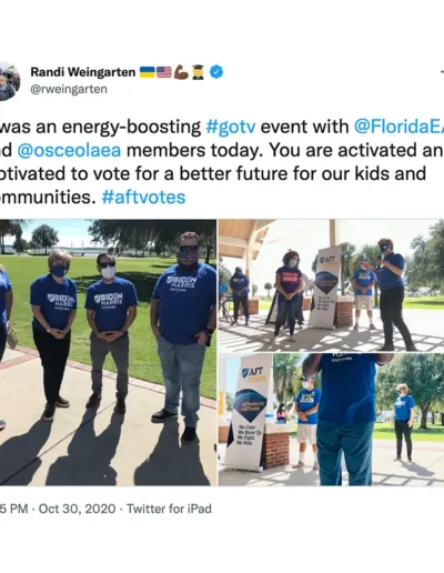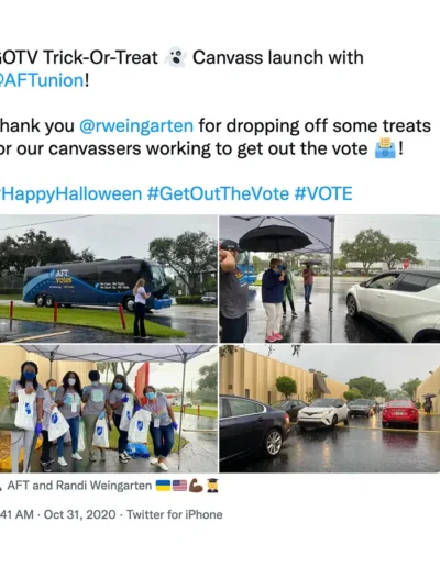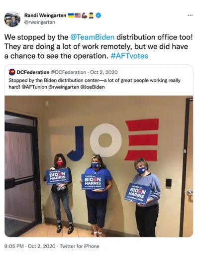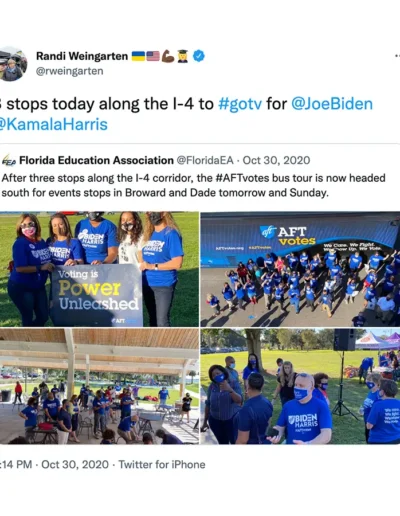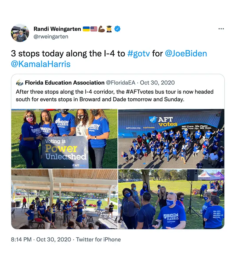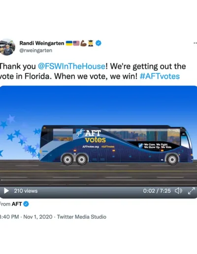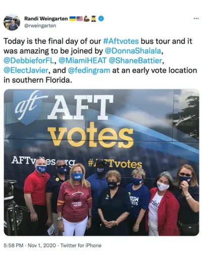 In late 2020, AFT launched a nationwide GOTV bust tour to “Stop Trump, Elect Biden and Harris.” Beginning on September 30, in California the tour included 24 stops where AFT leadership advocated for the election of Joe Biden and Kamala Harris to President and Vice President respectively.