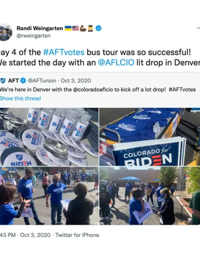 In Denver, AFT leadership “dropped in to say hello to workers at a distribution center for Joe Biden swag” and conducted a “literature drop for candidates who care about working people.”
