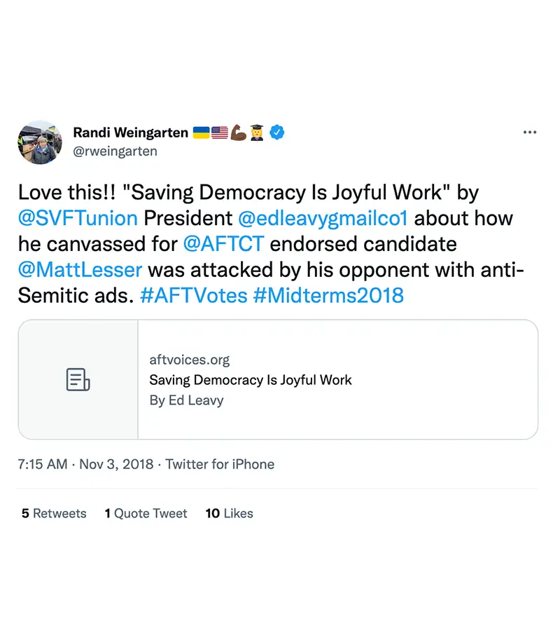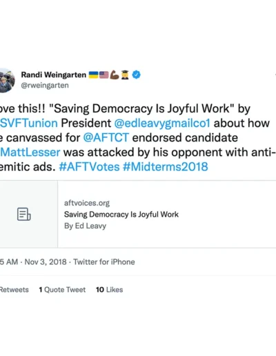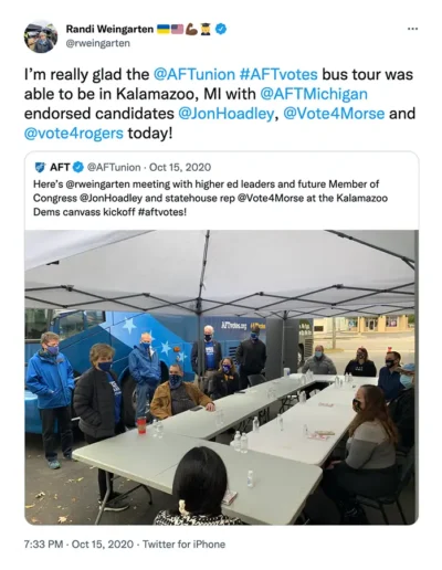 In Kansas, AFT hosted a “lawn chair chat” with Democrat candidate for U.S. Senate Dr. Barbara Bollier. AFT President Weingarten stated, in support of Dr. Bollier, “I can’t wait until November 3 because I want to see Dr. Bollier in the Senate.”