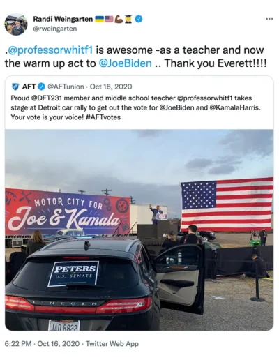 Tour kicks off “At the first stop in Los Angeles, a caravan of members of United Teachers Los Angeles drove to a Chevron refinery for a rally… … All three top AFT officers joined the Los Angeles teachers: AFT President Randi Weingarten, Secretary-Treasurer Fedrick C. Ingram and Executive Vice President Evelyn DeJesus. Together they urged UTLA members and their allies to support both Proposition 15 and the Biden-Harris presidential ticket.”