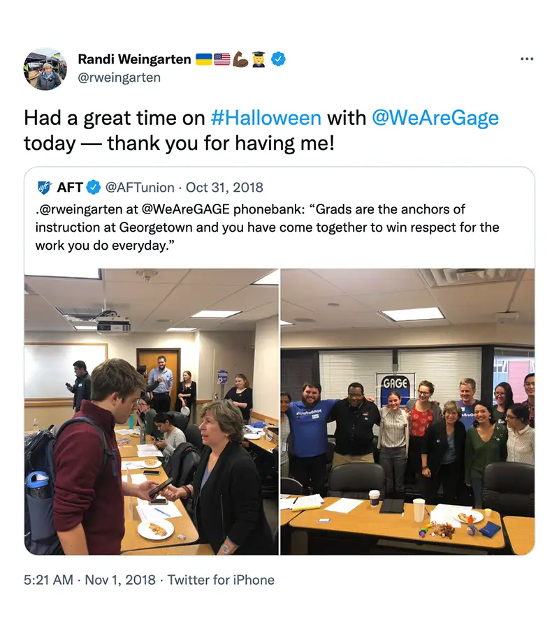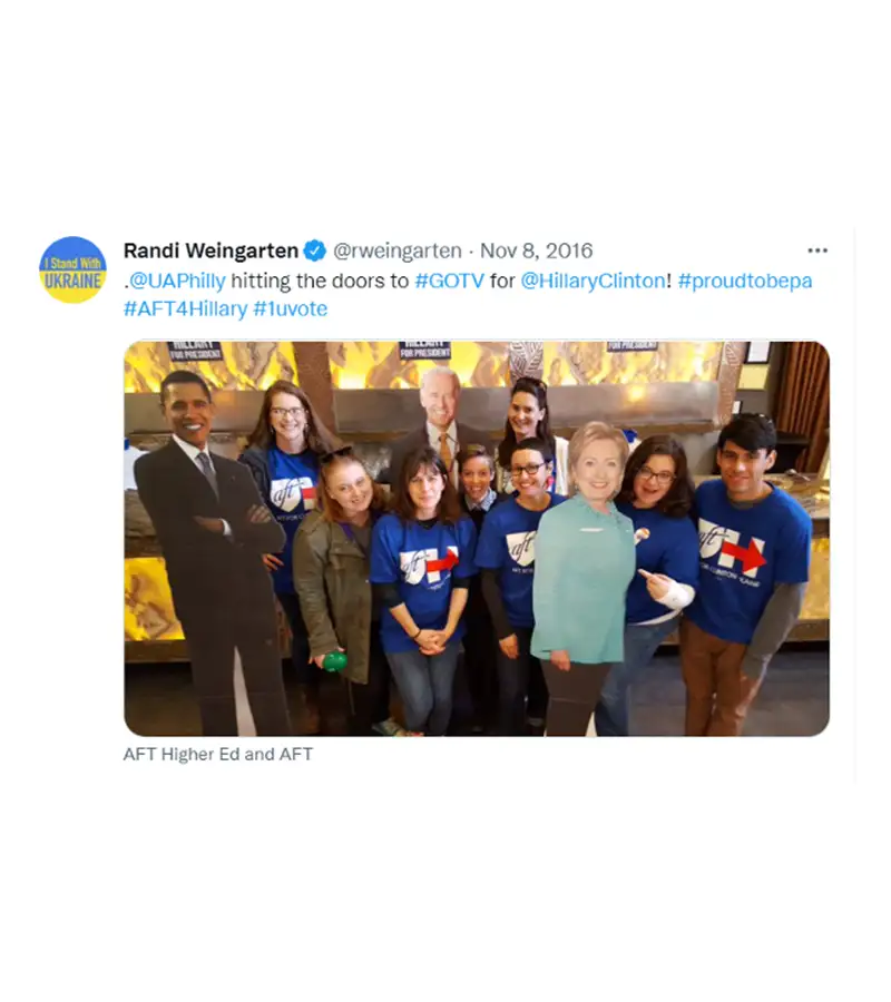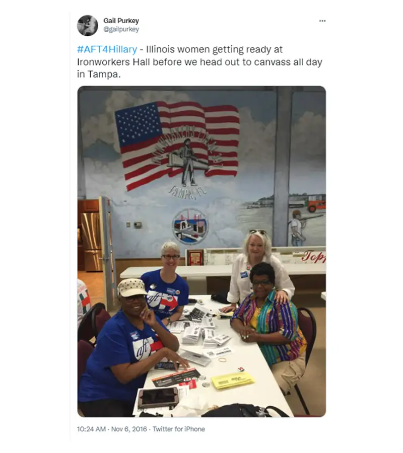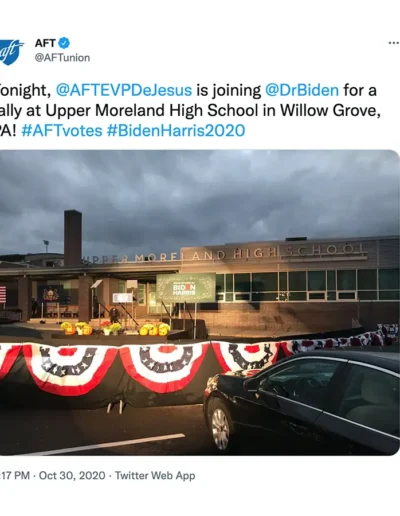 Throughout the tour, AFT leadership “urged support for Joe Biden and Kamala Harris.”