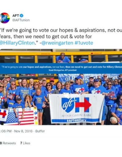 We did not find any evidence that the costs associated with the AFT’s massive political efforts to elect Hillary Clinton, Joe Biden, and numerous congressional candidates were reported to the IRS. It looks like AFT drove a bus through the guardrails set up by the IRS for tax-exempt organizations. The IRS must investigate to determine whether the AFT owes taxes or puts its tax-exempt status in jeopardy.